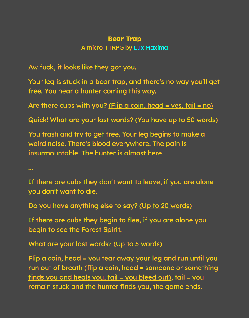 Your leg is stuck in a bear trap, and there's no way you'll get free. You hear a hunter coming this way.
